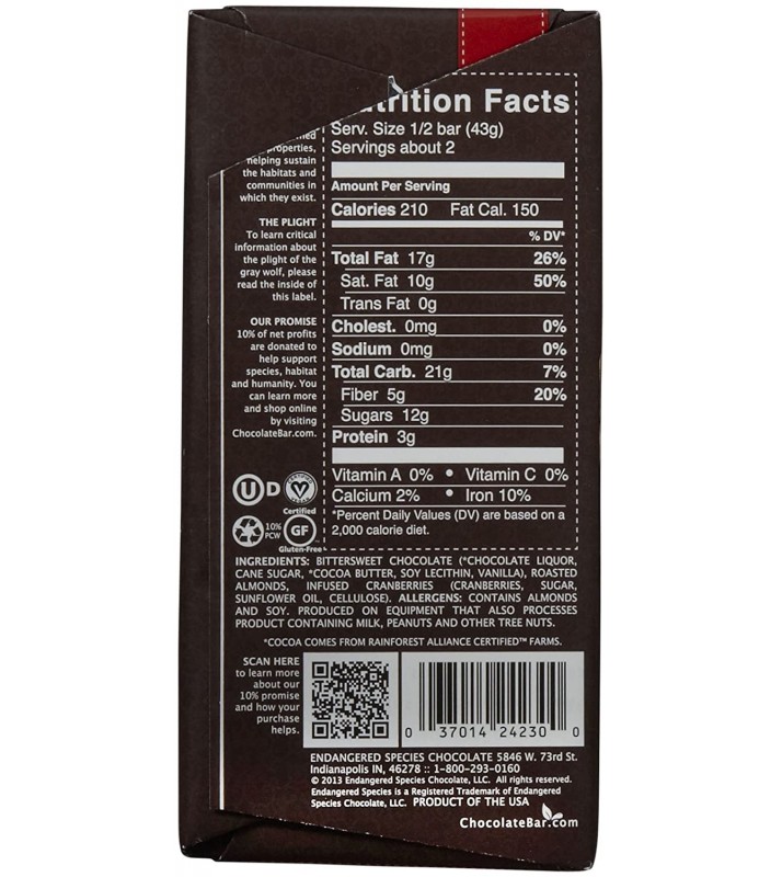 Endangered Species Chocolate Dark Chocolate with Cranberry and Almond Bar, 3 Ounce -- 12 per case. This