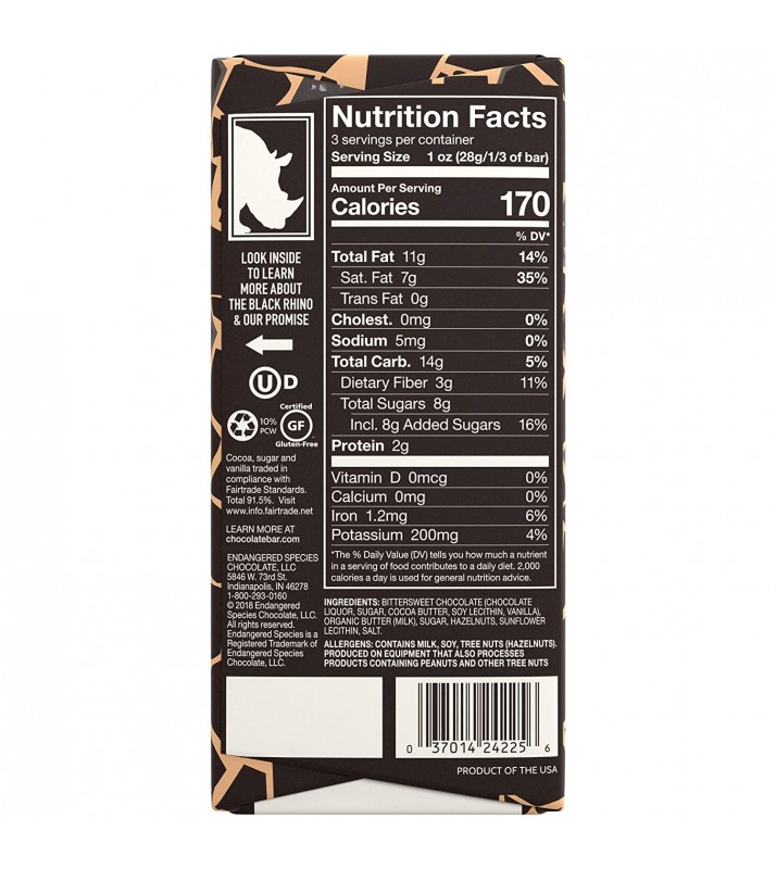 Endangered Species Dark Chocolate Bar Hazelnut Toffee Rhino (12x3 Oz)