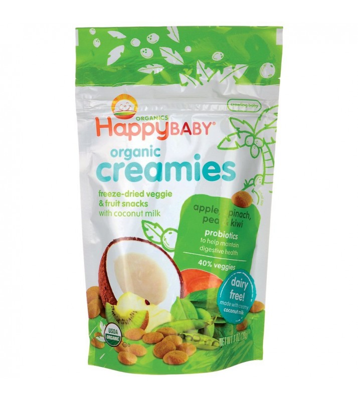 - COCONUT CREAMIES: For melt-in-your-mouth yumminess, reach for these delicious non-dairy drops. Happy Baby Creamies baby & toddler snacks are made with organic fruits, veggies & coconut milk. Each bag is at least 40% veggies, so grab a handful & smile.