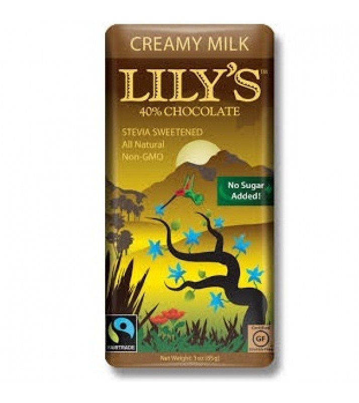 Enjoy Lily's Sweets Creamy Milk Chocolate, 40%. LilyÍs stevia-sweetened 40% chocolate with milk has