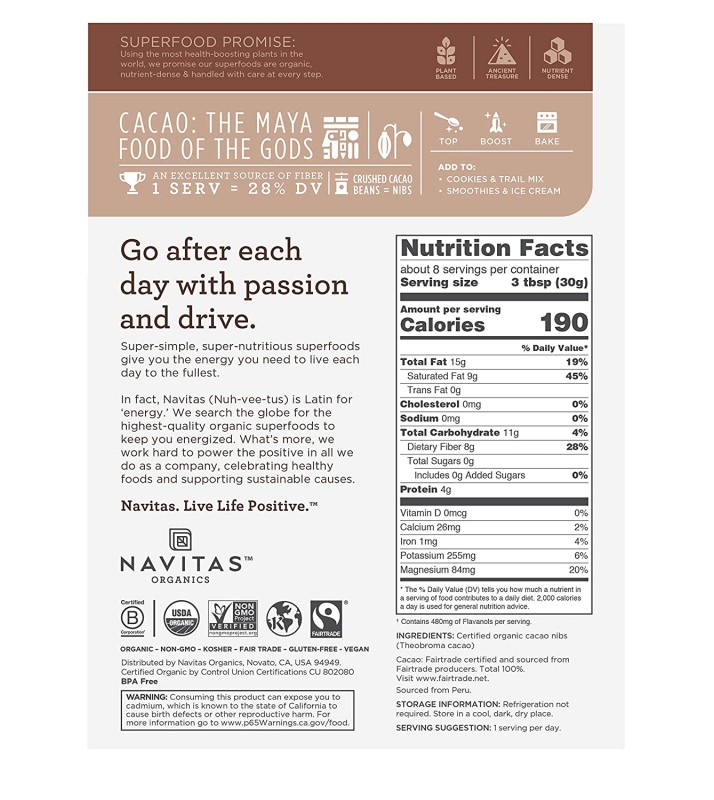 vitamins, antioxidants (flavanols) and fiber. Navitas Organics Cacao Nibs are made from a rare, non-hybridized