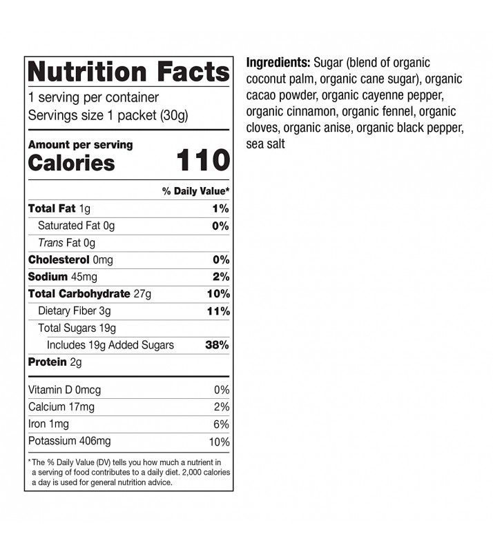 - Made with organic coconut palm and cane sugar, organic cacao powder and spices, sea salt.