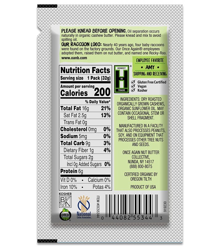 Product descriptionOnce Again Organic Cashew Butter is vegan, kosher and gluten free. Organic cashews seeds are dry roasted and milled. Oil separation occurs naturally. To prevent, stir and refrigerate or freeze. Once Again Nut butter offers a variety of gourmet nut butters, all of which are vegan and most are also organic. What does that mean? It means you can feel good about the products you consume. If you do not have good health, what do you have? Fuel your body the right way, all natural. They pride themselves on their high quality and wide variety of natural products. Product details
