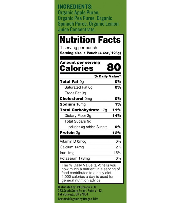 • INGREDIENTS: Organic peas, organic spinach, organic apples, organic lemon juice concentrate.