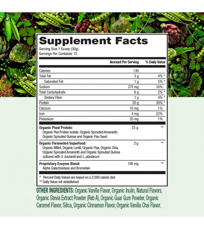 - SUSTAINS ENERGY – Our naturally flavored vanilla chai protein powder for men and women is packed with 20g of plant-based proteins including peas, artichokes, algae and organic superfoods, all hand-selected as part of our Select Source process.