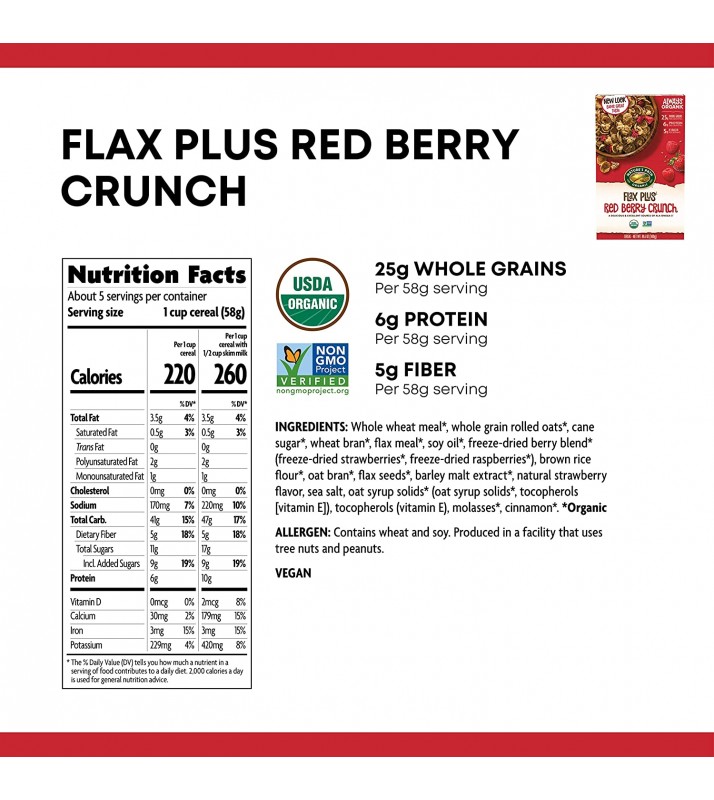- NATURE’S BEST TASTE: Indulge in the best of what nature has to offer when opting for this Flax Plus Red Berry Crunch Cereal each morning. The organic ingredients include a rich blend of sweet dried strawberries and raspberries, delicious granola clusters and ALA Omega-3 rich flax seeds for a fruity, nutty crunch.
