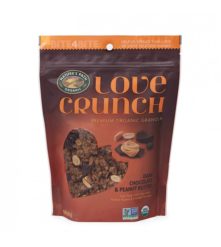• THE PERFECT COMBINATION: Dark chocolate and peanut butter were made for each other and you’ll make an instant love connection with just one bite of this Love Crunch Dark Chocolate Peanut Butter Granola. The crunchy texture, stemming from organic whole grain rolled oats, peanuts and Fair Trade chocolate chunks gives you just one more reason to adore Love Crunch.