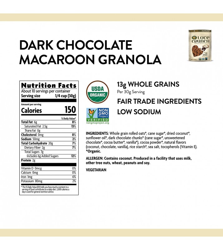 • Contains 1 - 11.5 ounce bag of Nature's Path Organic Love Crunch Premium Granola, Dark Chocolate Macaroon