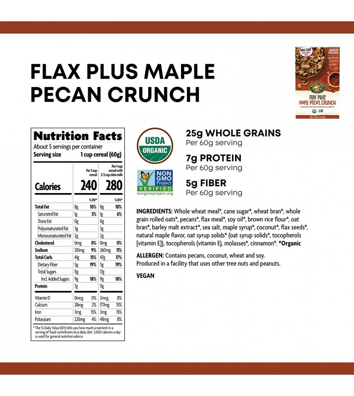 • NUTRIENT-PACKED BREAKFAST: Fill up on organic ingredients that provide you with the energy you need to tackle the day. Each serving of this Maple Pecan Crunch Cereal offers 25g of whole grains, 7g of protein and 5g of fiber.
