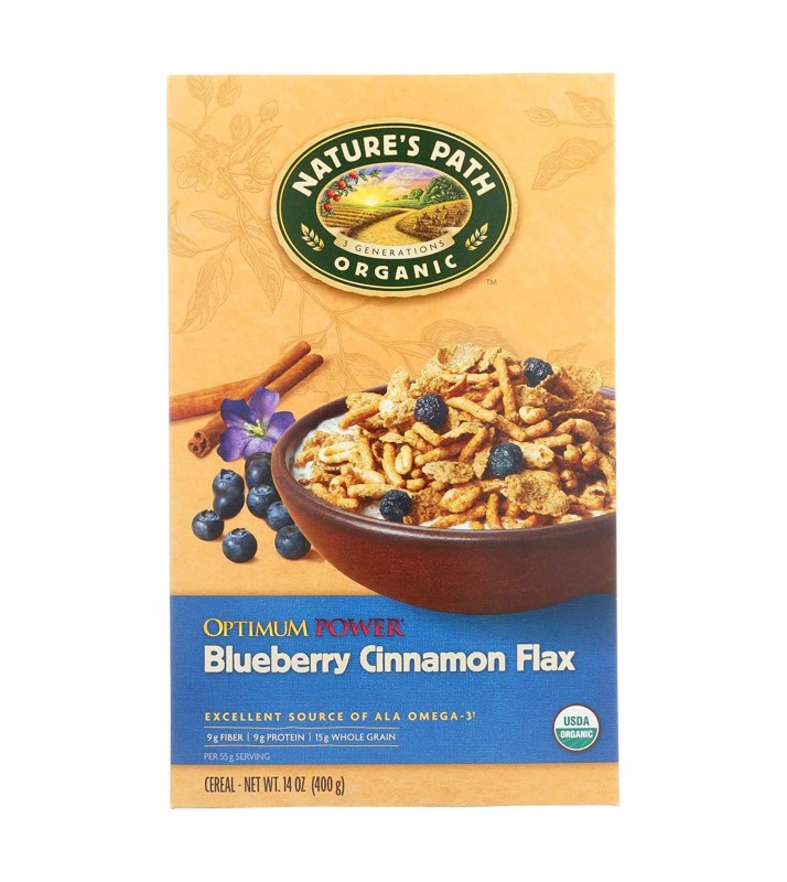 Nature's path blueberry cinnamon flax oatmeal in a 14 oz. Box is a 100% usda-certified organic oatmeal