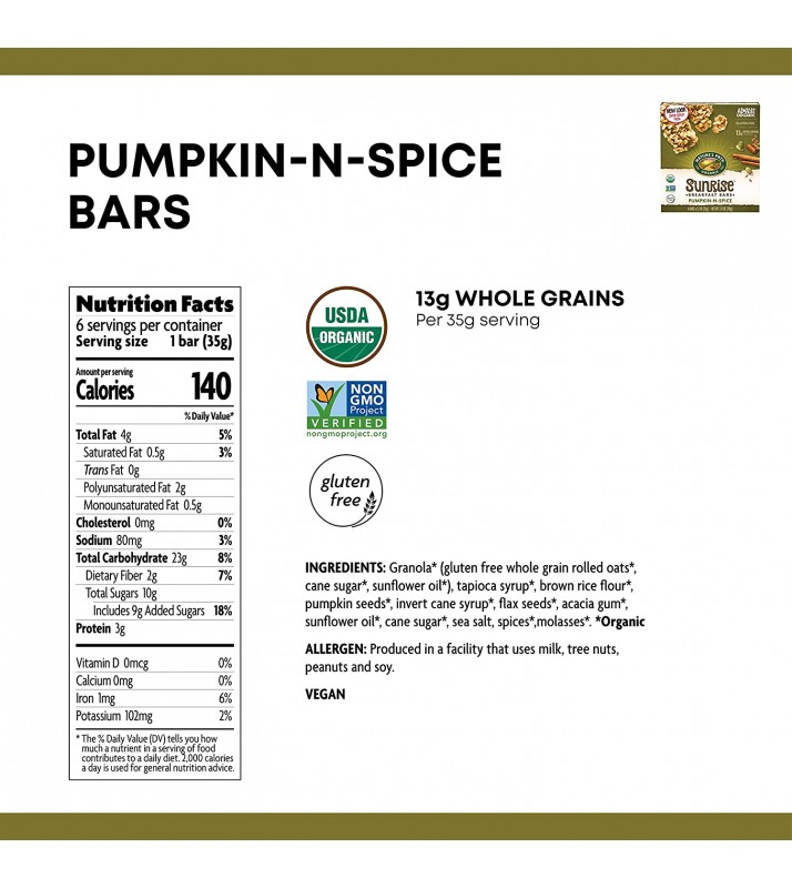 • Contains 6 - 7.4 ounce boxes of Nature's Path Granola Bars, Pumpkin-N-Spice Flax Plus (6 bars per box, total of 36 bars)