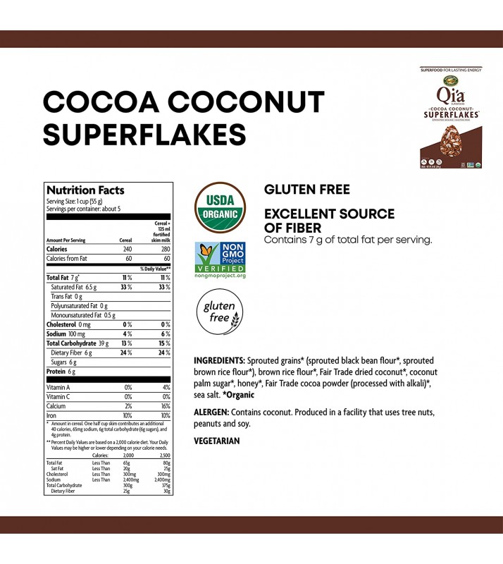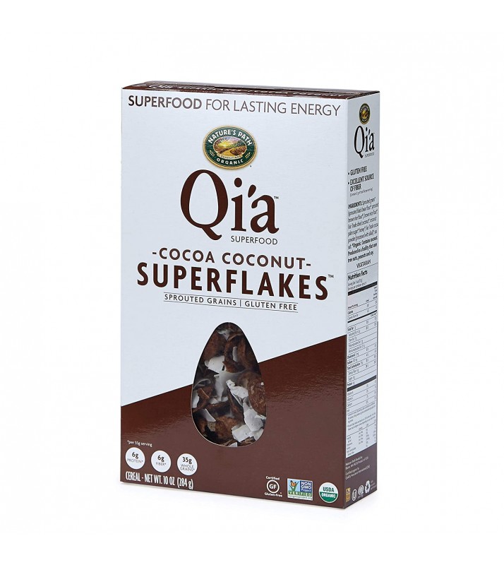 • SWEET AND SAVORY: Indulging in a sweet treat for breakfast doesn't have to be unhealthy. In fact, Nature's Path Qi'a Cocoa Coconut Superflakes Cereal embodies healthy with an organic and gluten-free blend of sprouted grains, Fair Trade dried coconut, honey and Fair Trade cocoa powder. The crunchy texture is just a bonus when you're seeking to satisfy your sweet tooth.