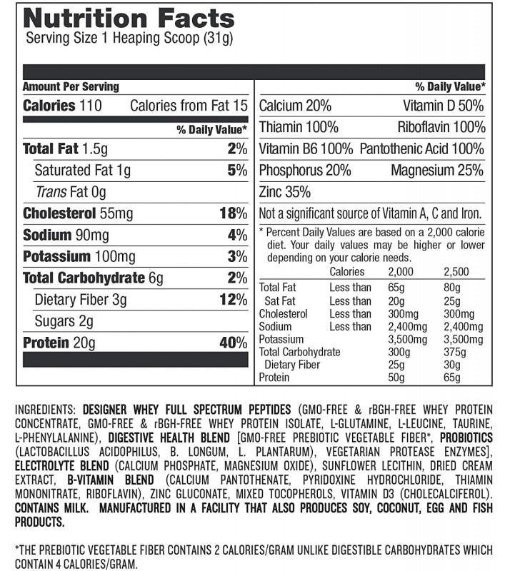 20g of natural, GMO-free whey protein concentrate and GMO-free whey protein isolate. Made with