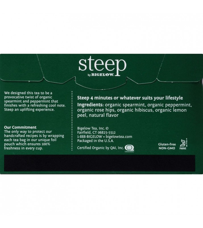 - INDIVIDUALLY WRAPPED: steep by Bigelow tea always come individually wrapped in foil pouches for peak flavor, freshness and aroma to enjoy everywhere you go! Gluten -free, calorie-free, & Kosher Parve, USDA Organic & Non- GMO Project Verified.