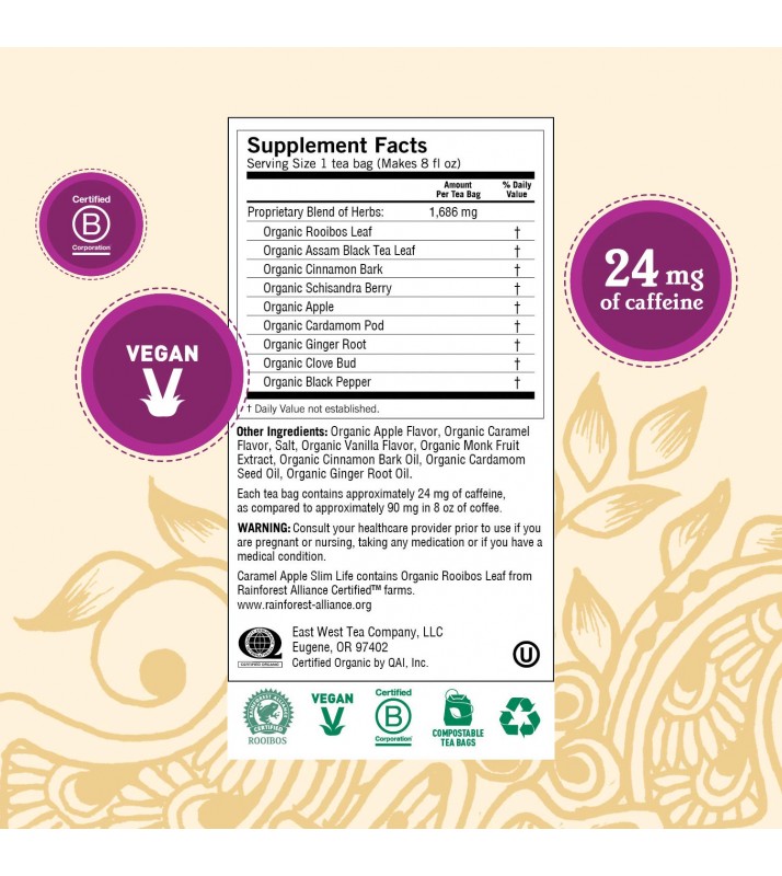 - Flavor: Yogi Caramel Apple Spice Slim Life tea combines bold Assam Black Tea and flavorful Rooibos with Schisandra Berry, Apple and rich Caramel flavor for a deliciously sweet and fruity blend.