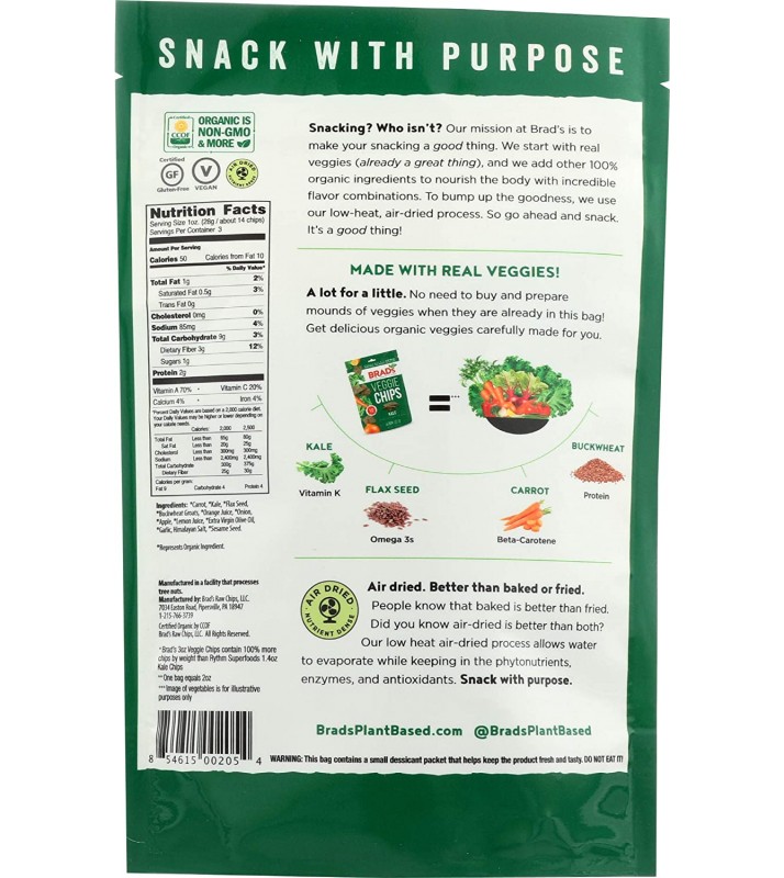 Enjoy brad's raw chips, kale. Made with carrots, kale, flax seeds, raw buckwheat groats, scallions,
