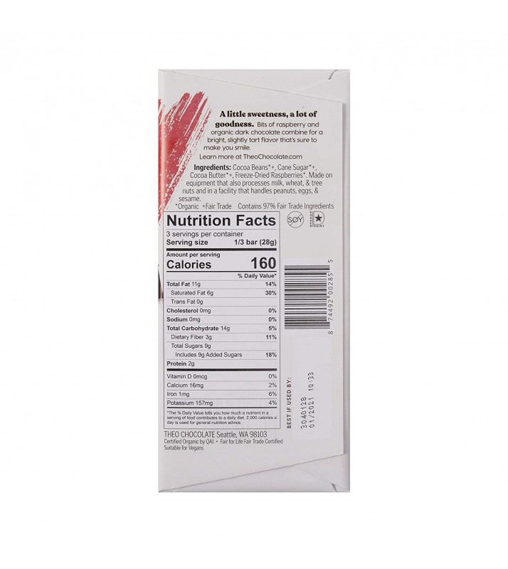 Pack of 12. Enjoy Theo Chocolate Raspberry, Dark Chocolate 70%.We start with the finest 70% dark