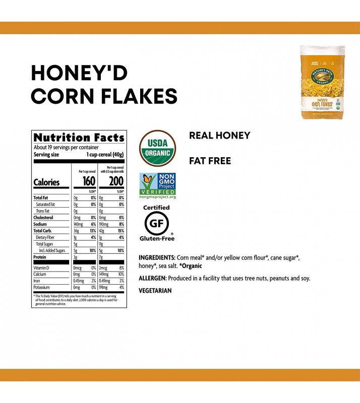 - CRUNCHY GOODNESS: Nature’s Path Honey’d Corn Flakes give you the opportunity to savor a hearty crunch and a sweet blend of organic ingredients. Enjoy the nutrient-packed blend of Non-GMO corn flakes topped with just a touch of honey to satisfy your sweet tooth. You deserve to enjoy the first meal of the day and with this delicious Honey’d cereal, you can do that and fuel your body with nutritious, organic and gluten-free ingredients.