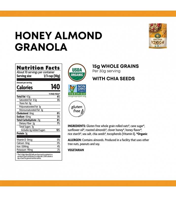 • SATISFYINGLY GOOD: Nature’s Path Honey Almond Granola will make your taste buds buzz! Made with ingredients like organic clover honey, premium crunchy Californian almonds and chia seeds mixed with gluten free whole grain oats, its a healthy, convenient breakfast (or snack!) for your busy bee lifestyle.