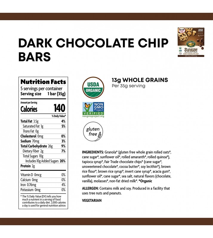• Combines the richness of Fair Trade Certified organic dark chocolate chips with whole grains and gluten free oats