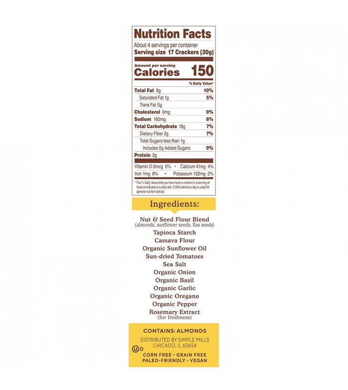 - SIMPLE INGREDIENTS: Nut and Seed Flour Blend (Almonds, Sunflower Seeds, Flax), Tapioca, Cassava, Organic Sunflower Oil, Sun-dried Tomatoes, Organic Onion, Organic Basil, Organic Garlic, Sea Salt, Organic Oregano, Organic Pepper, Rosemary Extract (For Freshness)