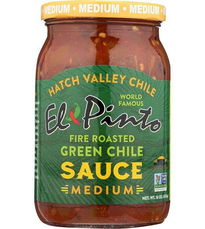 - FRESH INGREDIENTS: El Pinto’s Medium Green Chile Sauce is bursting with flavor! We use only fresh ingredients for this sauce. Enjoy the delectable combination of peeled tomatoes, roasted Hatch green chiles, caramelized onions, salt, and garlic.