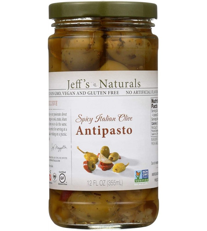 Jeff's naturals spicy italian olive antipasto is a colorful combination of large green olives, tangy peperoncini,