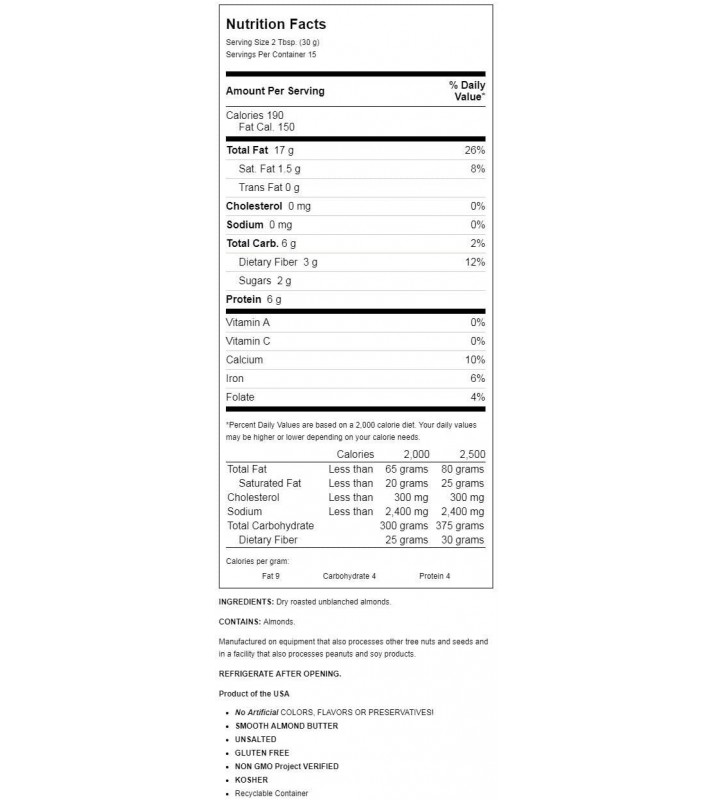 Woodstock Almond Butter is made from pasteurized California almonds. Slow roasted to preserve